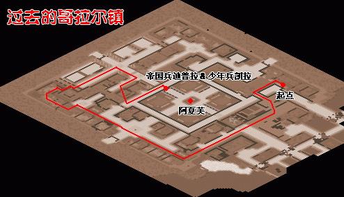 15.从哥城走到麦尼村(下图蓝线3)找月心爷交出特效药后,再次进入麦尼洞窟,来到刚才月心爷站的位置进入随机迷宫17层。