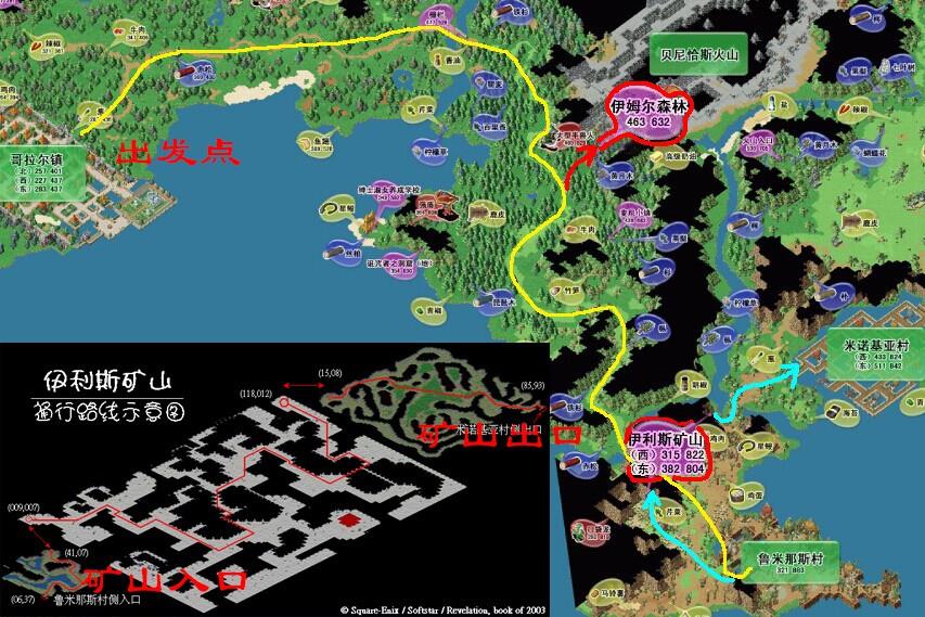 9.通过后对话交出火把被传出,回鲁村与长老对话拿称号魔鬼克星和奖品,奖品卖店1000。此时可以顺下图青色路线及左边矿山地图前往米诺基亚村开启传送。