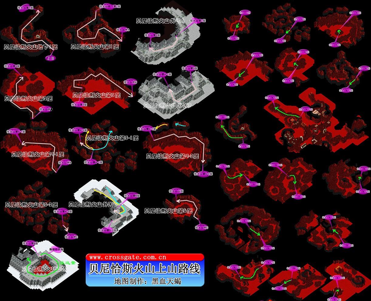 火山全地图 左侧白色为常规上山,黄色及青色为备选路线;山顶绿线可抵达远景,右边绿线为跳山后到达诺利路线。