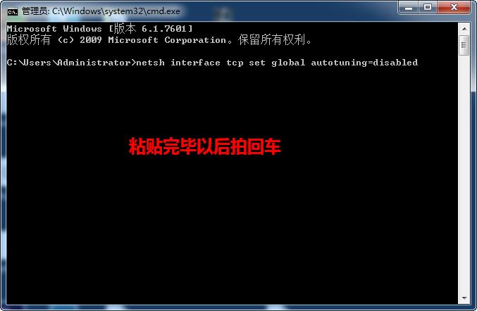 4、然后输入"netsh int tcp set global autotuninglevel=disabled"点击回车;