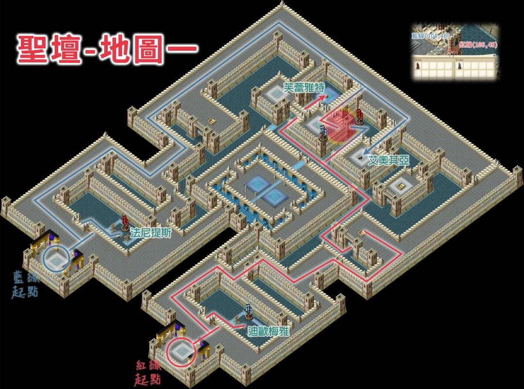 ◆圣坛各层行走路线,标准版:(男性角色走蓝色线路、女性角色走红色线路)