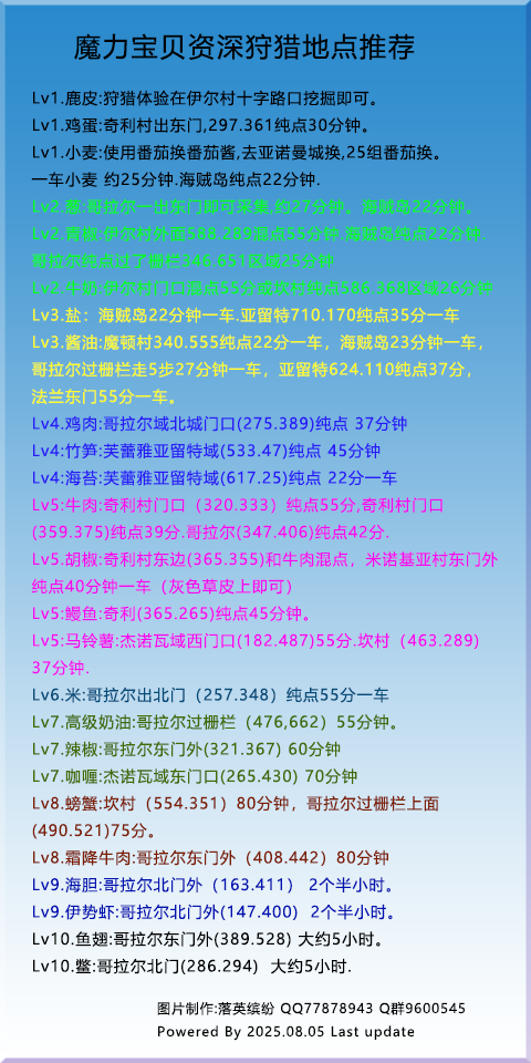 我的猎人技能只到了8, 1-8级的采集点我都摸过,时间可能没那么准确,一般误差在3到5分钟。