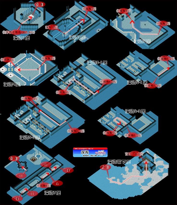 8.与歌姬对话后传送到中庭,下楼梯后蓝色小房间内往前走几步,通过隐藏楼梯,会被传送到库鲁克斯岛的地图,此处可以1.遇敌为神盾、海蝙蝠,便于传教疯狂的补血,2.可以接宠邮。从这里开始一直到打完再没有任何地方能接了。下楼梯传送到深海。深海遇敌2只八岐大蛇,风系,类似前面北国地洞的水准,攻相当高,会召唤尸妖(蓝色死神),这里有条件带火属性二动双偷跑,没条件的别带地属性就行。