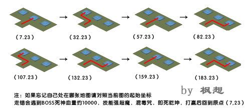 11.与歌姬说话后往东走进入黑之宫殿,这段怪物又回到了死神。 这里有8次选择,每次3个房间。选对则继续前进;选错就必须打倒Lv80的死神,之后传回最开始的原点。