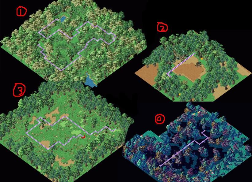 11.出村后往左边走到(354,630)与侍女对话进入诅咒者之洞窟(地)(下图紫线4),随机迷宫20层,怪为地属性三头龙1至2只,这里攻击比前面高诸刃打700+而且会定人,不太好打。