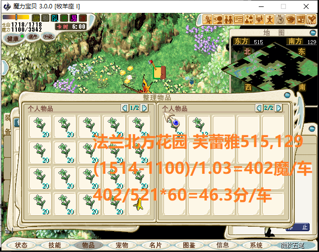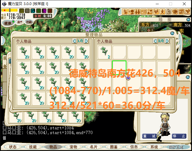 德威特岛南方花园426,504,1084魔开挖(上面截图耗时,多挖了一点扔了),770魔结束 (1084-770)/1.005=312.4魔/车,折算312.4/521*60=36.0分/车